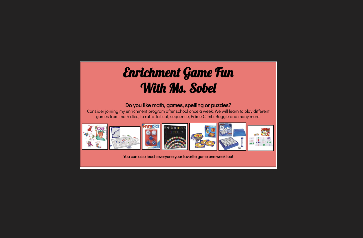 Get ready for an afternoon of strategy, logic, and laughter! Join the Enrichment Game Fun club for an engaging after-school experience where playing and learning collide. Students will have the opportunity to master a variety of games, including Prime Climb, Sequence, and Boggle. When playing these games, you’ll have so much fun, you’ll forget you’re even learning! A collaborative environment is highly encouraged, so participants are invited to bring in their favorite games from home to teach their peers, too. Come explore, strategize, and learn new games!